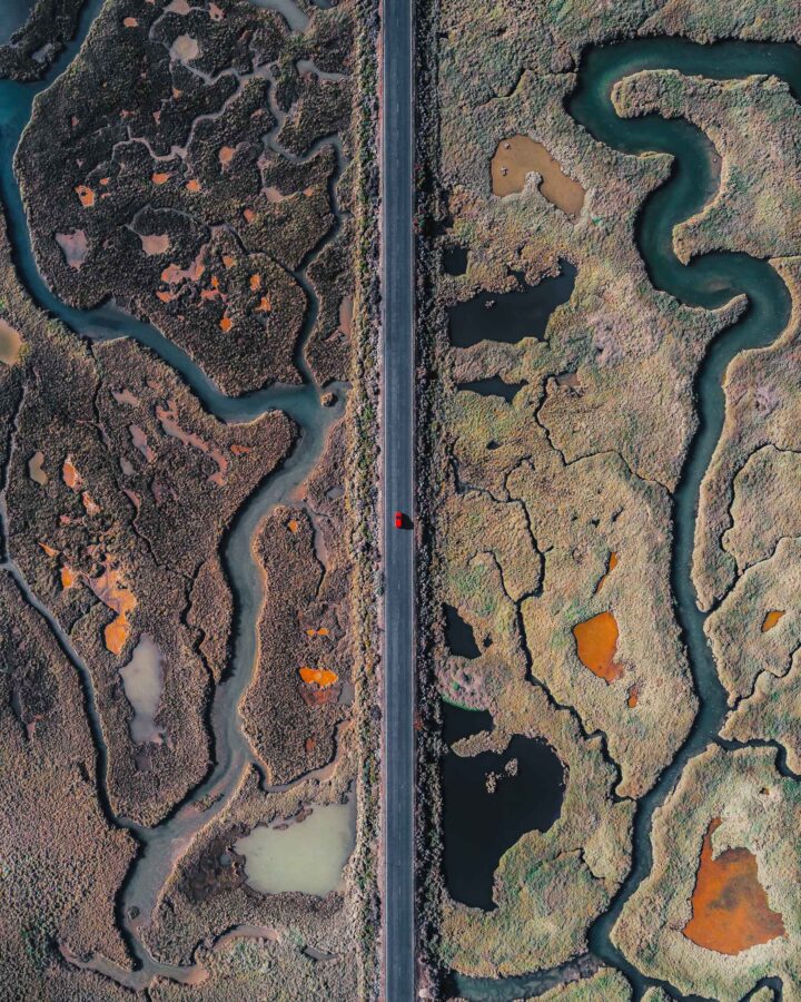 ‘End of the Road’ was another image we spent quite a lot of time trying to find. Marshlands are some of our favourite things to photograph from the air. Although the abstract patterns and textures they create are amazing to see, the problem is that it’s very difficult to appreciate the scale of what you are looking at. We wanted to find something that helped show this and a on our last European road trip, we finally found what we had been searching for near a place called Huelva. There happens to be a road crossing right through one of these wonders of nature and luckily for us, our little red hatchback helps add to this perspective!