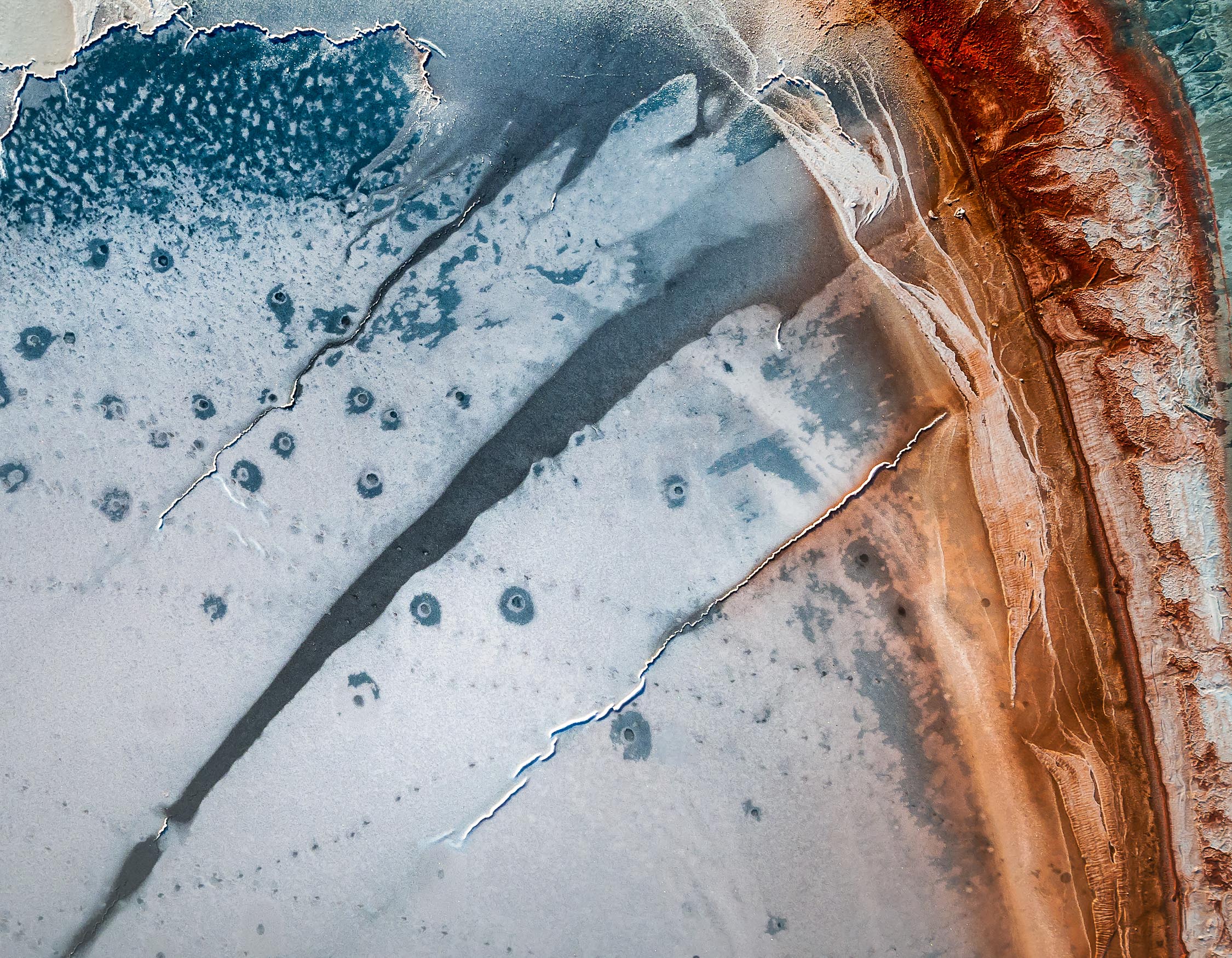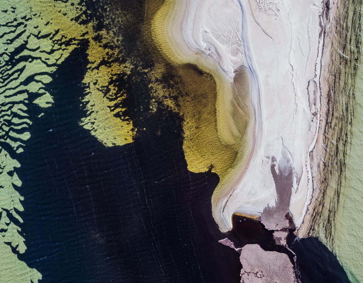 The images below are some of the first we ever took with a drone and the inspiration for what has become Abstract Aerial Art. Truthfully, it was by complete accident that it came about and not something we set out to do at all. Initially, our rough plan was to make documentary style films from the remoter parts of Australia that we had seen during the first part of our adventure. This idea changed fairly quickly once we started to see the landscape from above. As we pointed the camera directly down towards Earth and started taking photographs, we saw a perspective of the world that immediately interested us. The more bizarre it looked, the more we liked it and this style of drone photography was not something we had really seen anybody else doing. We were immediately hooked on the way that landscapes and structures looked from above. Based on our first few photographs loosely reminding us of abstract artworks, we developed the idea to compose all of our images as if they were exactly that. This is how Abstract Aerial Art was born! Of these initial shots, two were taken in South Australia and the other two in Western Australia. They show an oil pond, a section of a salt lake, a sand spit in the ocean and an abandoned zinc mine. We’ll leave you to decide if you can work out which is which!